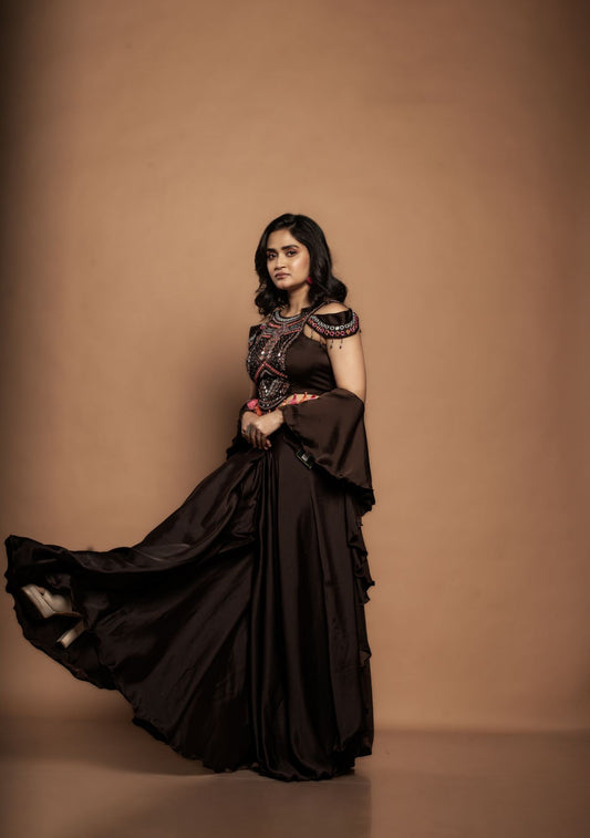 Sienna | Indo-Western Pure Satin Crop-Top Set with Mirror work in Chocolate Brown