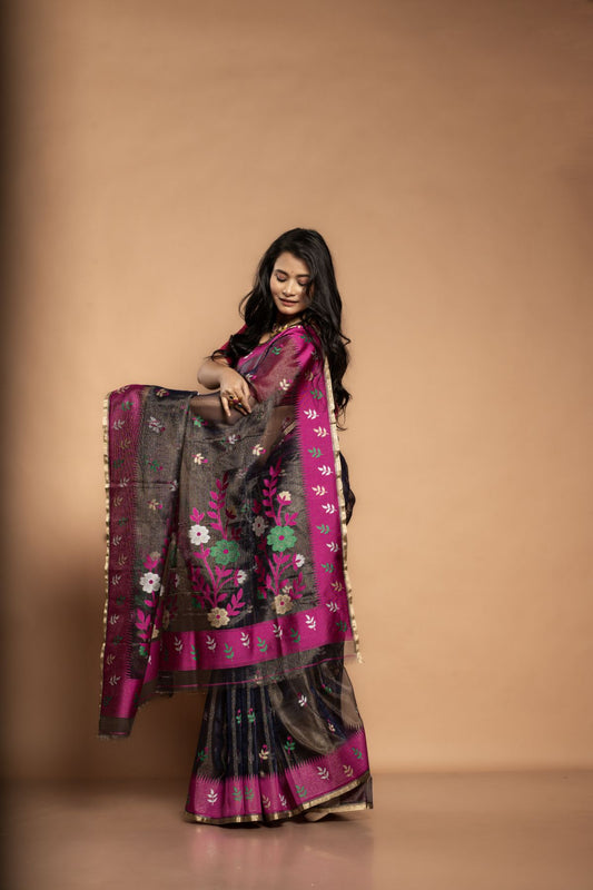 Kalpana | Pure Muslin Tissue Saree with Floral Rani Pink Border in Black