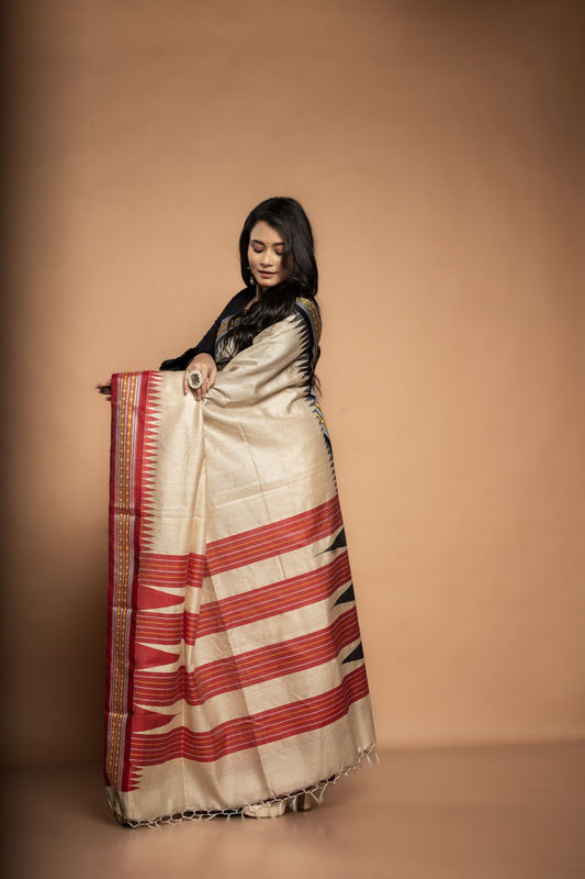 Pratima | Vidarbha Tussar Saree with Ganga-Jamuna Border in Cream-Red