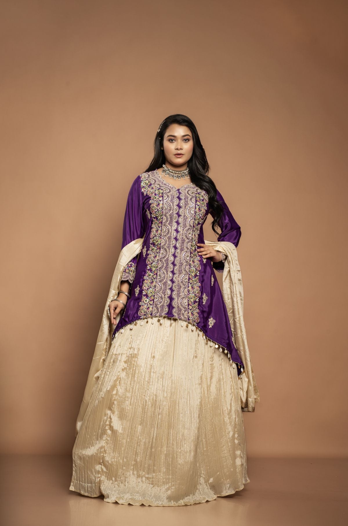 Mallika | Indo-Western Chinon Kurta-Set in Purple and Cream